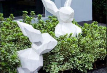 這是一組玻璃鋼材質的幾何塊面兔子雕塑,以抽象創意造型為特點,適配戶外景觀場景。它用棱角面體重構兔子形態,極簡白色與自然環境相襯,兼具裝飾性與耐用性,是兼具藝術感與實用性的景觀裝飾小品。